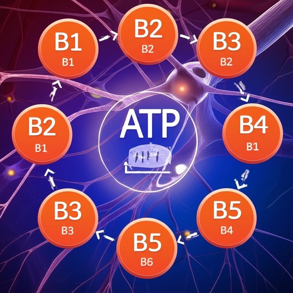 비타민B군은 에너지 대사와 신경 건강에 필수적인 영양소로, 각각의 비타민B가 고유한 기능을 수행하며 유기적으로 연결되어 있습니다. 에너지 대사에서는 탄수화물, 지방, 단백질 대사 과정의 조효소로 작용하여 ATP 생성을 돕고, 신경 건강에서는 미엘린 유지, 신경 전달물질 생성, 신경계 에너지 대사에 관여합니다.