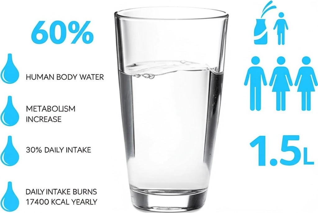 체내 수분 증가는 '물 유도 체열생성(Water Induced Thermogenesis)'이라는 과정을 통해 대사율을 높입니다. 이 과정에서 물을 마시면 교감신경계가 자극되어 에너지 소비가 증가합니다. 실제로 하루에 최소 1L의 물을 추가로 마시면 매일 약 100kcal의 에너지 소비량이 늘어나는 것으로 추산됩니다. 연간으로 환산하면 약 17,400kcal로, 이는 약 2.4kg의 지방 조직에 해당하는 에너지량입니다.